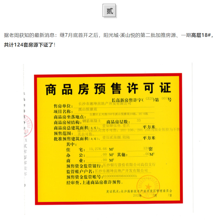 开发商:长沙市湘坤房地产开发有限公司      预售证号:湘新建售许字(XX23)第113号      填入即视为同意《个人信息授权与保护申明》